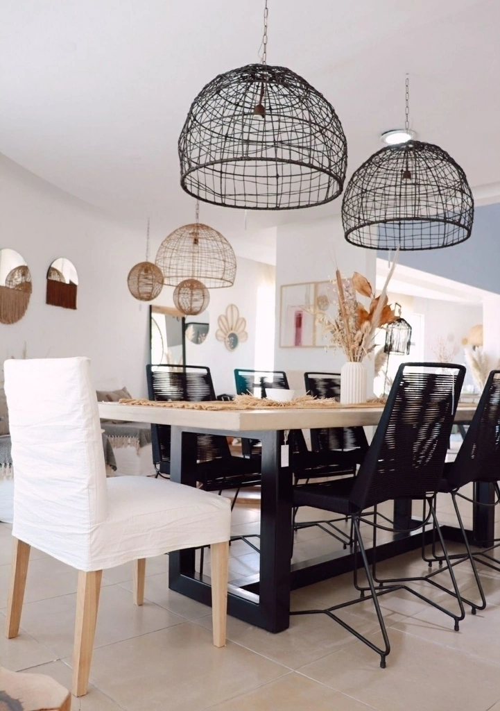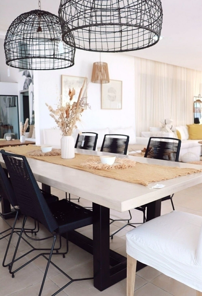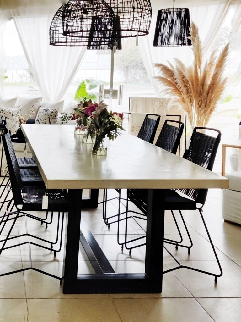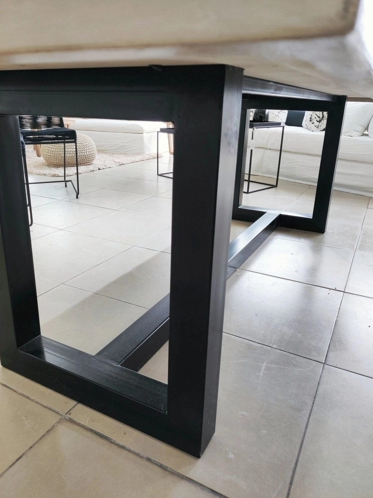 Mesa de microcemento color blanco tiza, arena, negro, gris claro o oscuro con patas de hierro en U color negro.