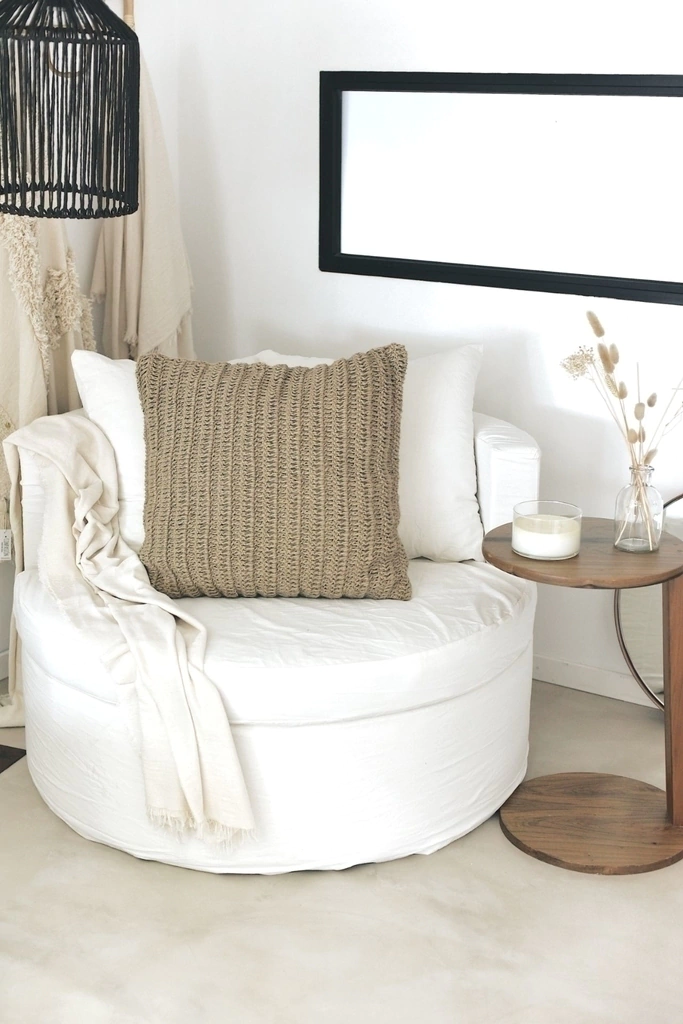 Tapizado en lienzo con funda en tussor (color a elección), con almohadones de respaldo cuadrados.